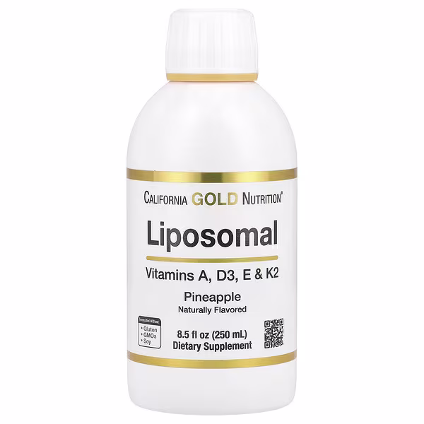 California Gold Nutrition 脂質體維生素 A、D3、E 和 K2 含多種維生素,封裝在脂質體混合物中,且為天然鳳梨味。這種液體補充劑提供了一種將這些維生素添加到飲食中的方便方法。補充劑可直接服用,或混入果汁或水中。